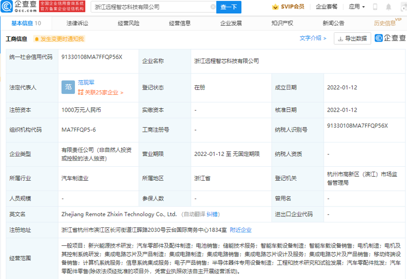 1月12日,浙江远程智芯科技有限公司成立。该公司由吉利投资企业全资控股。