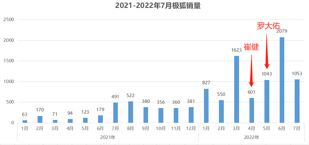 虽说自从崔健演唱会后,极狐的销量出现了连续2个月爬升,到6月达到2079辆的顶峰,但到了最近的7月份,又掉回到1053辆了,还不如没开演唱会时3月的销量。