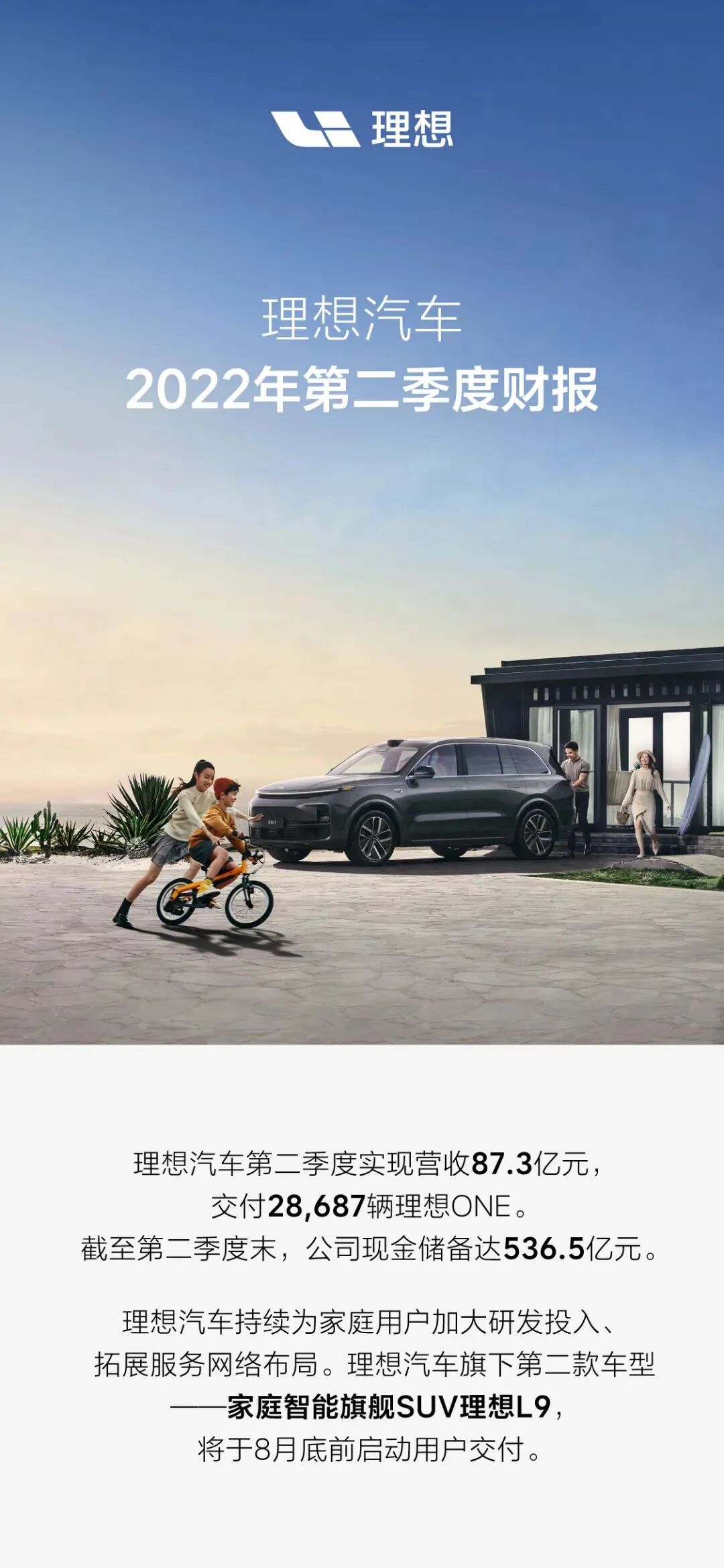 8月15日,理想汽车发布了2022年第二季度财报。理想汽车第二季度营收87.3亿元,同比增长73.3%;第二季度交付28,687辆理想ONE,同比增长63.2%。同时理想汽车宣布,理想L9将于8月底前启动用户交付。预计第三季度交付量为27000-29000辆,收入总额为89.6-95.6亿元。