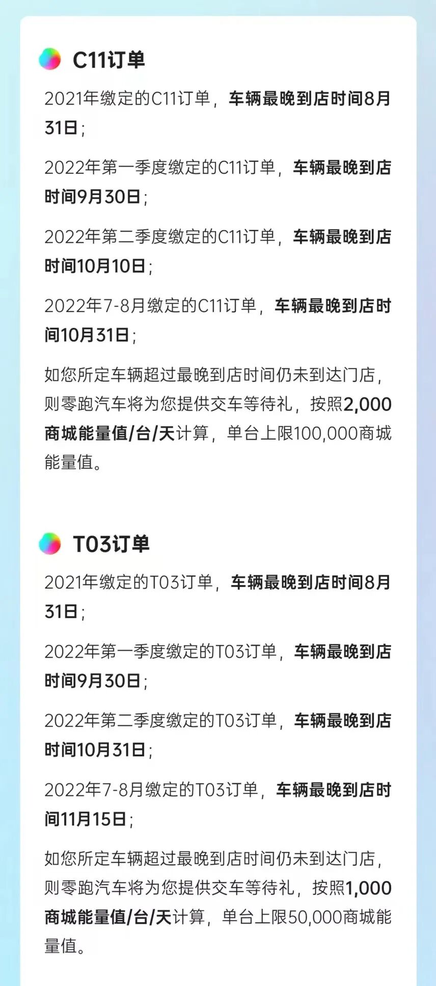 零跑汽车在官方APP上发布了交付承诺公告,表示随着供应链的逐渐稳定,零跑汽车交付速度将快速提升,其中涉及到零跑C11和零跑T03两款车型。同时官方表示,如果相应的订单新车未能按承诺到店,用户将获得相应的“交车等待礼”。