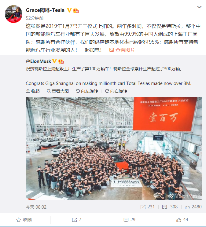 马斯克周日在推特上表示,特斯拉已经生产了超过300万辆汽车,并且其中上海工厂生产了100万辆汽车。估计是为了表示真情实意地感谢上海工厂,马斯克还专门发了一条微博。