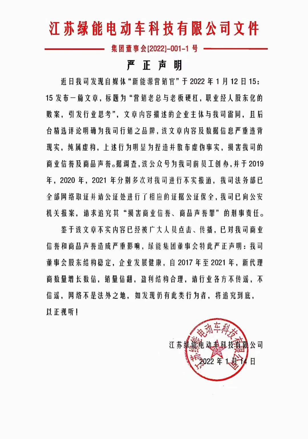 1月14日,绿能官方公众号发布《严正声明》,直指行业某自媒体近日发布的一篇文章,捏造并散布虚伪事实,损害了绿能商业信誉和商品声誉。