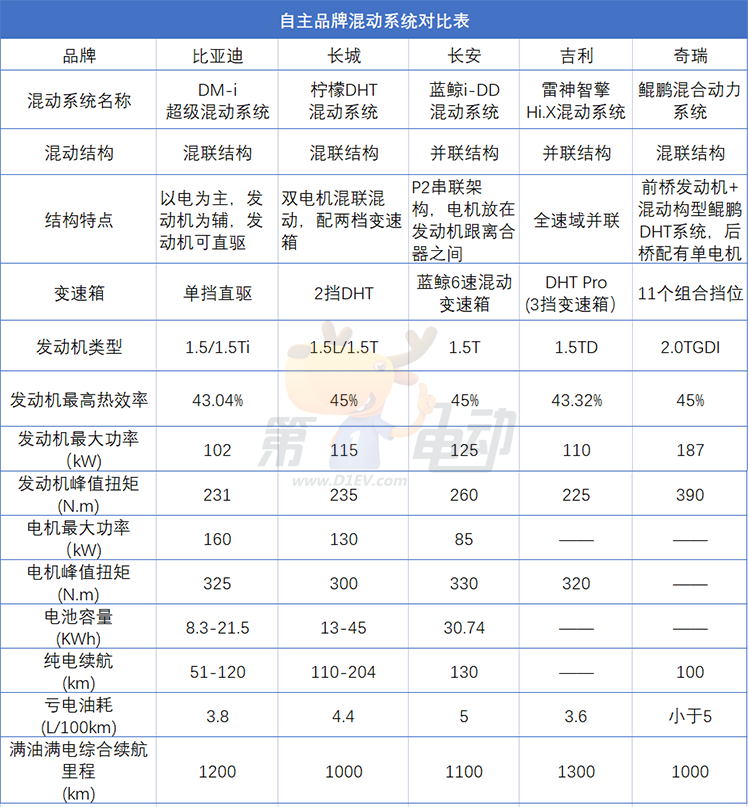 说到混动系统,当然,除了丰田本田这两个混动元老级别选手,国内自主品牌也在积极研发属于自己的混动系统,并且混动产品的密集推出将让自主车企的销量“更上一层楼”。本文意在帮助用户初步了解比亚迪、长安、长城、奇瑞、吉利这几家主流的自主品牌在混动领域的研发成果,希望能给用户带来些帮助。![]()