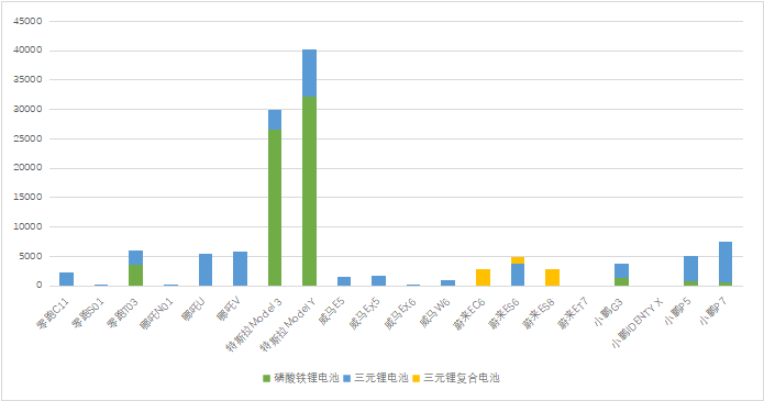 12月三元电池共计装车11.1GWh,同比增长84.7%;磷酸铁锂电池共计装车15.1GWh,同比增长118.5%。磷酸铁锂的装机量是快速超过三元的。从各个汽车企业来看,谁是排头兵?下面是从车辆型号的匹配来看的分类,从12月交付的车辆来看,特斯拉、比亚迪和五菱的铁锂化非常迅速(75%以上),紧随其后的是长安和欧拉(40%以上)。而大部分其他汽车企业目前还在筹划阶段,主要受限于磷酸铁锂的产能和整车的切换速度。图5中国12月根据车辆的动力电池类型分类情况特斯拉在磷酸铁锂的应用中速度和比例是最快的,如下图所示,这占据了新造车的绝大部分。按照近6万台估算,特斯拉一家用了3.6GWh的铁锂电池。而蔚来使用了最新的磷酸铁锂和三元复合的技术,75kWh三元复合的电池大概目前的数量占了蔚来整体一大半。小鹏目前还没能有效拿到足够的磷酸铁锂产能,所以目前绝大部分都是围绕三元电池来做的。零跑在T03里面,拿到了不少的铁锂电芯,所以铁锂化的速度也比较快。![]()