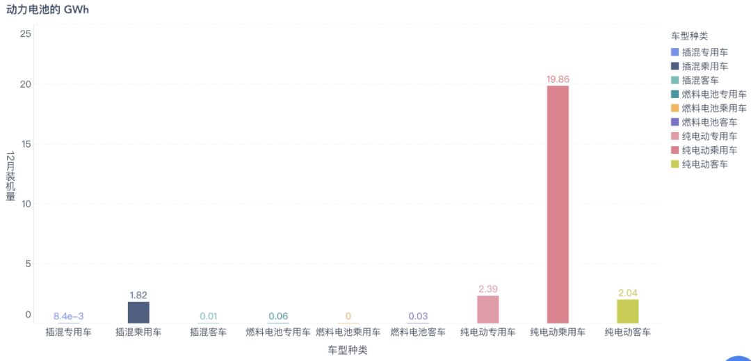 12月份单月的需求,插电式混动乘用车为1.82GWh,纯电动商用车4.43GWh(纯电大巴2.04GWh和纯电卡车2.39GWh),纯电乘用车还是遥遥领先的19.86GWh。![]()