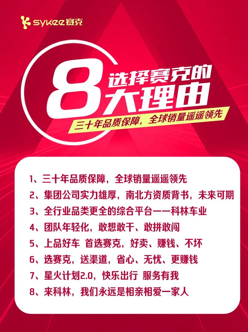 北方名企赛克已经拥有30年的岁月沉淀,在刚刚结束的2021年里,顶住一车一票政策、原材料涨价、市场竞争加剧等因素影响,取得骄人成绩,品牌、产品、渠道、销量等维度都创历史新高。凡益之道,与时偕行。赛克能够行稳致远30年,与其与时俱进、抓住机遇、精准定位分不开。从赛克隆重启动“快乐出行 服务有我”的全新品牌定位以来,赛克实现品牌的全面升级,精准聚焦服务,更是体现出以客户为中心的理念。赛克拥有一套完整的售后服务体系,优质服务是对每一位客户的承诺。想用户之所想,急用户之所急,干用户之所需,解用户之所难,赛克将服务的方方面面都落实到行动中,让车主和经销商没有后顾之忧。此外,赛克在产品方面下苦功,一方面打磨品质,与优质配套供应商达成战略合作,继续坚持高质量、高标准要求,另一方面,对产品进行了大面积的更新换代。依托天津电动车生产基地(简易款)、无锡电动车生产基地(豪华款电摩)、货运三轮、休闲三轮等基地,赛克在电自产品的优势之上,豪华款也是做的有声有色,深受市场欢迎。品类齐全,资质完善,赛克加大市场覆盖面,为不同消费人群提供更多个性化选择和更好的产品体验,也为经销商多加一重保障和溢价空间,市场竞争力强势提升。做赛克,能赚钱!提起赛克,星火计划就是品牌最受经销商关注的热点。2021年赛克推出星火计划2.0版本,前所未有的支持力度、清晰的的市场定位、超高性价比的产品,如同一针强心剂,掀起加盟热潮,订单更是屡屡创下新记录。对于一个品牌来说,电动车的质量和真挚服务是成功的关键因素。赛克电动车产品和服务双管齐下,专注每一个细节,力求把每一个细节做得完美,在厂商良莠不齐、品牌生生灭灭的电动车市场,资质齐全、实力雄厚的赛克电动车始终屹立不倒。2022,赛克电动车虎虎生威,必将再接再厉,为实现树百年企业的目标继续奋斗!