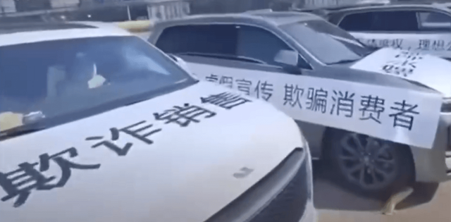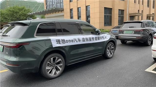 有人在理想ONE上拉起了横幅,横幅上写着“理想ONE汽车 虚假宣传 欺骗消费者”、“欺诈销售”等标语。