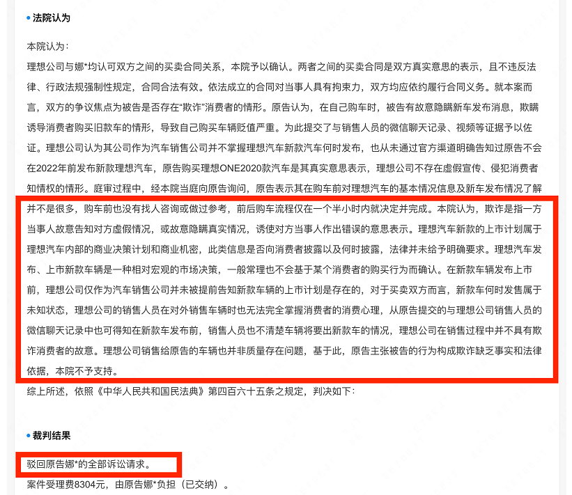 法院认为,理想ONE新款上市属于理想汽车内部的商业决策计划和商业机密,这类信息何时向消费者披露,法律并没有给予明确要求。