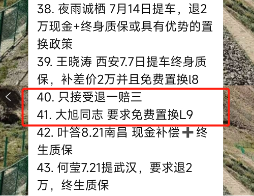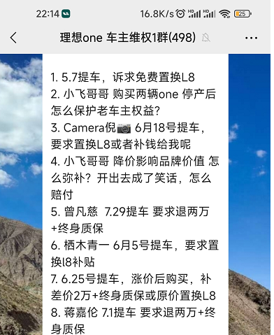 群里有要求退2万元差价的,有要求终身质保的,有要求免费置换理想L8的,有要10-20万积分的,有要加油卡的,有要免费充电的,有要求升级4缸机的,有要求免费8155车机芯片的.......