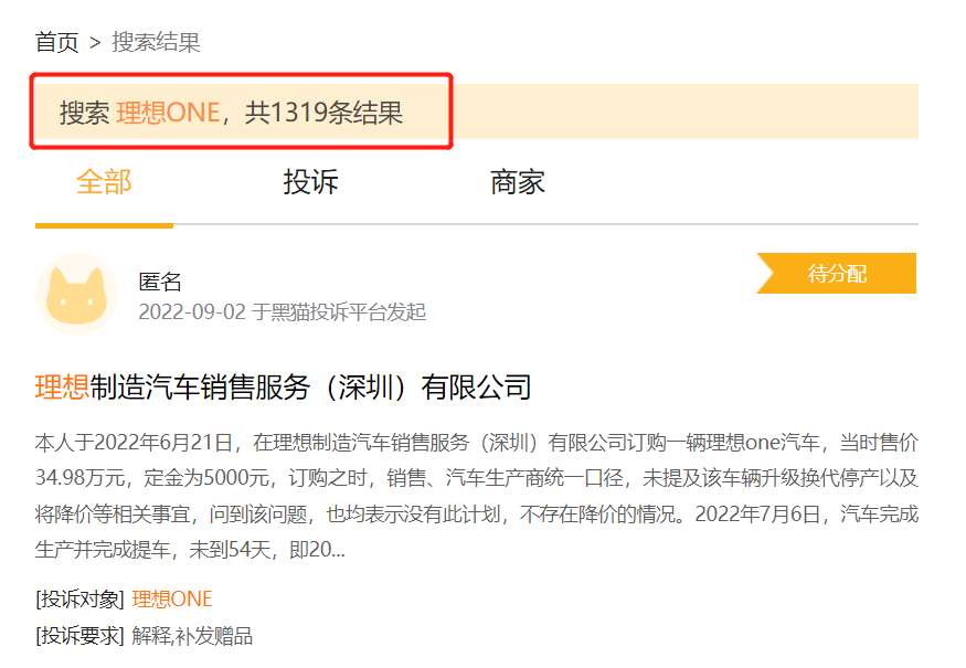黑猫投诉平台上,理想ONE词条的搜索结果,也一度飙升至多达1300多条。