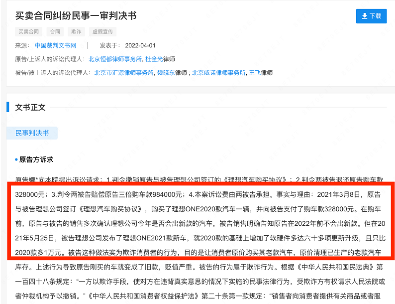 去年就因为理想2021款改款这事,还真的有位车主专门以“销售欺诈”为由,将理想汽车告上了法庭,要求“退一赔三”,总金额高达98.4万元。