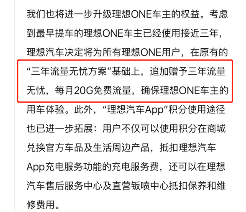 “理想汽车将为所有理想ONE用户,在原有的‘三年流量无忧方案’基础上,追加赠予三年流量无忧,每月20G免费流量,确保理想ONE车主的用车体验。”
