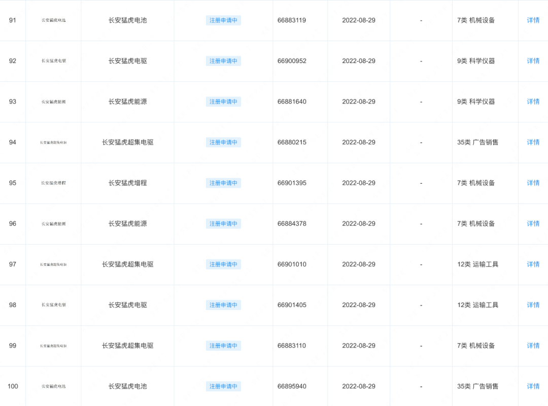长安汽车申请注册“蔷薇电池”“猛虎电池”等商标