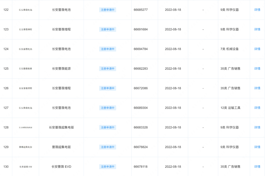 通过企查查等网站显示,近日长安汽车申请注册了一批商标,包括“长安蔷薇dian”“蔷薇超集电驱”“长安蔷薇能源”“长安蔷薇增程”等,国际分类包括科学仪器、广告销售、机械设备等,当前商标状态均为等待实质审查。