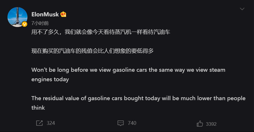 9月13日,马斯克又发推炮轰燃油车,表示“不久之后,我们将以看待蒸汽机的方式看待汽油车”,“今天购买的汽油车的剩余价值将比人们想象的低得多”。而同样的内容,也发布在了国内的微博上。
