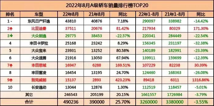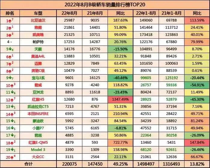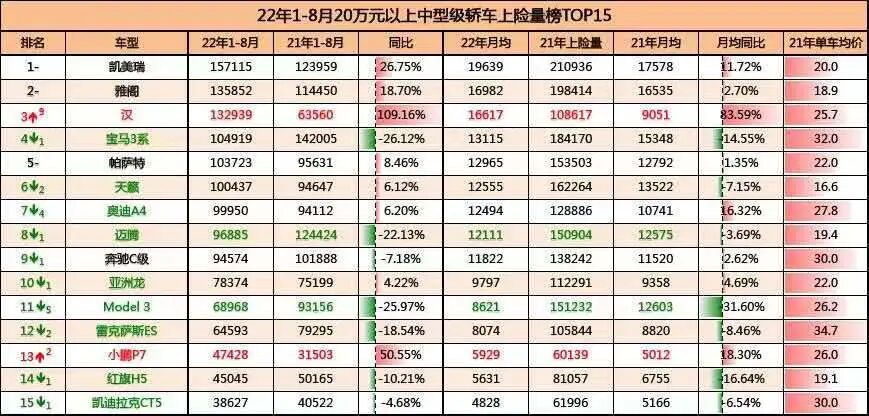 一方面市场总量没有本质变化,另一方面比亚迪无论是市场份额还是同比销量都创造了新高?问题来了:总量同比不变的情况下,有人同比大幅增加,就一定有人同比大幅减少!8月,比亚迪汉以25987辆的成绩,超越这个级别曾经的王者——雅阁、凯美瑞,荣登主流B级轿车销量冠军,当然TOP20的主流B级轿车不仅包含合资品牌产品也包含BBA的入门产品。