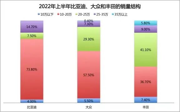 而从城市量级来看,比亚迪各量级城市的经销网络分布与大众基本相当,但是由于比亚迪已经进入100%新能源化的阶段,所以在一线和新一线城市占比中,比亚迪要比大众略高。从整体销量结构来看,比亚迪的整体销量集中在一二线城市,份额占比达到63.8%,而大众品牌(南北大众)在一二线城市的份额只有56.4%,比亚迪比大众高出了7.4个pct!在比亚迪占优的一线城市,比亚迪的销量占比为12%,更是接近大众的两倍了!而大众无论是经销商数量还是布局都更偏向于三、四、五线城市,所以大众在四、五线城市份额超过比亚迪6个pct。比亚迪和大众的如此的销量结构分布,是不是超过了大部分人的心里认知呢?2021年比亚迪与大众的单车销售均价都在14-15万元之间,比亚迪也是几大自主车企品牌中单车销售均价最高的。在2022年1月份的时候,比亚迪的品牌月度单车平均成交价是15.4万元,略低于大众品牌的15.6万元,到了8月份,比亚迪的单车均价已经来到17.2万元,已经连续5个月超过大众品牌。从这个发展趋势来看,随着售价20万+的比亚迪海豹的交付,全年比亚迪的均价水平超越大众也是顺理成章的。从细分市场来看,比亚迪在10-20万元的主流市场与大众品牌的销量不分伯仲。其中,海豚已经是10-12万元A0级市场的销量冠军,宋Plus和秦Plus则A级车销量的TOP3,其中宋Plus已经是SUV品类的销量冠军,而排在秦Plus的只有轩逸和朗逸。在20万元以上的市场中,比亚迪相比大众品牌的销量,还略有差距,但这种差距的本质主要是车型数量导致的。如果仅看单一车型,汉已经成为所有B级以上轿车的销量冠军,而唐也是细分市场热销产品。当比亚迪凭仅借新能源在销量上超过了常年领先的合资品牌,同样也凭借新能源乘用车的热销在单车成交均价上也超过了合资品牌的时候——比亚迪是不是主流品牌?又取代了谁的销量?大家应该一目了然了。在这个新能源时代的浪潮里,比亚迪紧紧把握住了两大核心机会:第一,是顺应了新能源时代的趋势,把自己的产品体系全面切换到100%新能源的状态!第二,开始改变过往燃油车时代里,合资品牌所引领的定价规则和逻辑。而第二点则更加重要,因为掌握定价权才是中国乘用车市场最难的事情!未来,一旦趋势和规则改变之后,取代合资品牌将不仅仅是比亚迪一个自主品牌了!