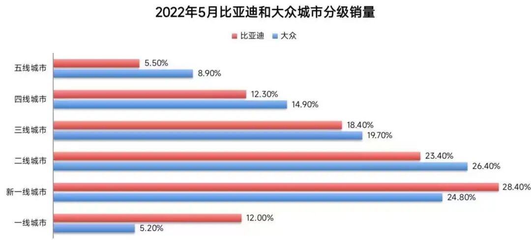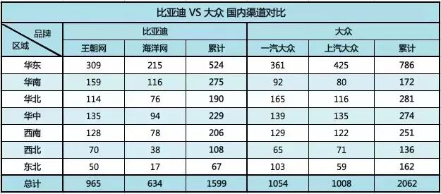 从22年1-8月累计数据来看,实现同比正增长的只有比亚迪秦、本田思域和别克威朗三款车型,其余无论是老三样还是宝来、速腾等大众曾经占据优势的A级轿车,同比下滑均超过10%以上。同时,丰田的雷凌和卡罗拉的销量下滑也更是超过25%。预计到年底,比亚迪秦有望冲击月度A级轿车销量冠军(距离轩逸的月销量相差6-7000辆),和年度的亚军(距离现在的第二名只相差下2400辆)。对于A级SUV市场而言,比亚迪宋在今年彻底取代了哈弗H6的SUV霸主地位。8月以42477辆的销量遥遥领先于CR-V、H6、RAV4和CS75Plus等一众竞品。在1-8月累计数据上,比亚迪宋更是成为唯一一个销量超过20万辆的车系。而传统A级SUV的诸多豪强们,如H6、RAV4和CS75Plus的销量同比下滑超过20%。在TOP10榜单中,能够实现正增长也只有比亚迪宋、比亚迪元Plus、丰田威兰达、大众途岳等四款车型。可以说,在A级车市场中,比亚迪秦、宋和元Plus都成为今年的爆款车型,他们同比销量增长都超过100%。而被取代的主要是大众和丰田的轿车,丰田、长城和长安的SUV。这个级别曾经是本田和丰田的优势市场,飞度、致炫一直是这个市场的绝对霸主。但是,今年随着比亚迪海豚的热销,彻底打破了A0级轿车市场的“平衡”。8月海豚销量23298辆,相当于2-5名的销量总和,而曾经的“王者”飞度和致炫则下滑到月销量6-7000辆的水平了。从累计销量的角度来看,除了比亚迪海豚和欧拉好猫以外,其余的燃油车型都陷入全面的下滑,并且同比下滑的比例几乎都是在15%以上。在A0级轿车市场中,比亚迪取代的就是本田、丰田、大众等传统合资品牌。从整体的车型销量结构来看,秦Plus系列与宋Plus系列构成的主流A级车市场,已经对合资车企的同级产品造成了分流;海豚以及更入门的海鸥,完全命中了合资车企的薄弱环节;汉、唐系列组成的B级车矩阵,虽然整体体量还略小于大众与丰田同价位车型,但在单一车型的绝对销量上已经开始突破,特别是汉已经成为B级以上轿车的月度销量冠军了。综合来看,大众是这一波新能源浪潮下最受伤的车企,也是被比亚迪替代最多的合资车企。1-8月,比亚迪平均月销在12万辆,可以说已经进入了主流品牌的销量区间。今天,就从经销网路、销量结构、销售价格变化三个方面来详细对比一下比亚迪和大众。截至6月30日,比亚迪在全国共有1599家门店和1031家展厅类网点。其中,王朝网门店965家、海洋网门店634家,其它的城市展厅类、分销商等合计约1031家。大众品牌(南北大众)合计的门店总数是2062家,其中一汽-大众1054家,上汽大众1008家,大众品牌的门店以经销商为主,没有其他类别。从门店数量上看,比亚迪的门店数量略低于大众,特别是海洋网的门店数量,无论是对比一汽大众还是上汽大众,都略显不足。但比亚迪今年的渠道改革速度非常快,不仅仅在加快渠道的建设,更是不断学习新势力增加城市展厅,并通过分销商等渠道的布局来迅速增经销网络覆盖面。从区域分布结构看,在乘用车消费最大的华东和华南两个区域市场里,比亚迪和大众品牌在华东市场的门店数基本相当,但在比亚迪自己的大本营——华南市场中,比亚迪的门店数量相比大众品牌有很大的优势。
