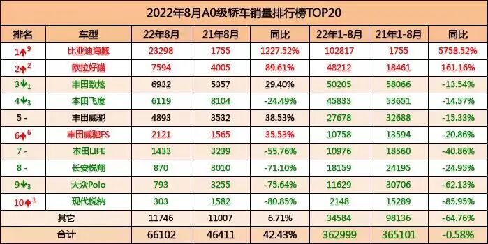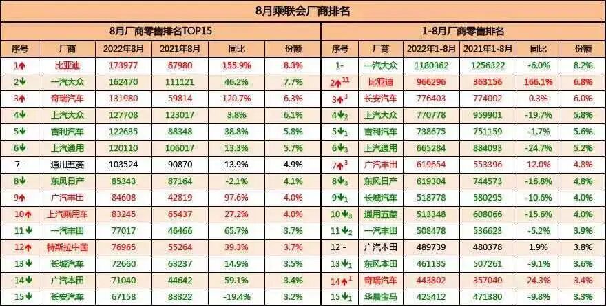 6月份以来,比亚迪的月度销量犹如脱缰野马,屡创新高。从2021年的10名开外,直接进入到TOP3的行列。根据乘联会公布了8月厂商零售销量的排行榜。8月比亚迪再次超越一汽大众,成为月度批发销量和零售销量的“双料冠军”!从1-8月累计数据来看,比亚迪的销量为966,296辆,同比增长166%,较2021年的排名提升了11位,来到了厂商零售榜的第二位,较之一汽大众差了22万辆。同时,整个市场1-8月份累计销量为1,295万辆,同比增长仅有0.1%。