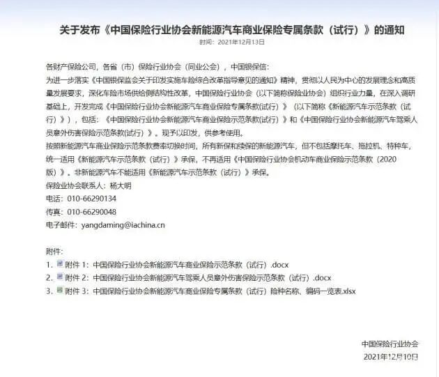 本月中旬,中国保险行业协会正式公布了《中国保险行业协会新能源汽车商业保险专属条款(试行)》(下称《条款》),包括:《中国保险行业协会新能源汽车商业保险示范条款(试行)》和《中国保险行业协会新能源汽车驾乘人员意外伤害保险示范条款(试行)》。