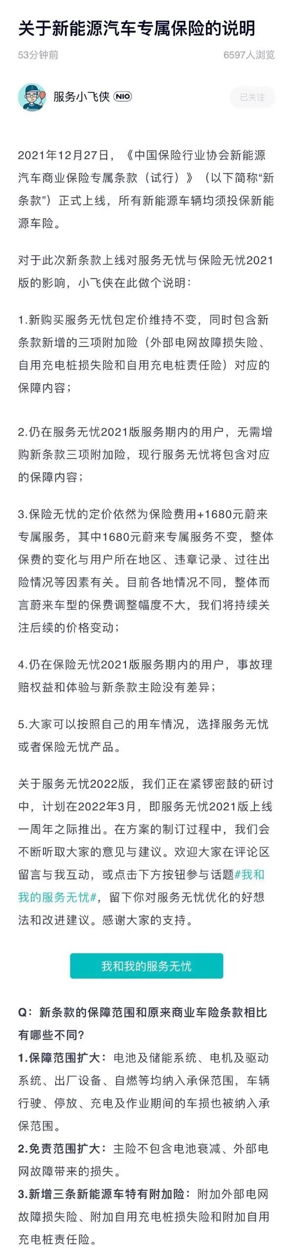 蔚来也第一时间在蔚来App上发布消息推了一波专属服务“服务无忧”,并称,整体保费的变化与用户所在地区、违章记录、过往出险情况等因素有关。目前各地情况不同,整体而言蔚来车型的保费调整幅度不大,我们将持续关注后续的价格变动。