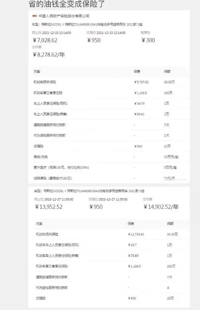 据报道,就在新能源汽车专属保险上线的当天,就有一位特斯拉车主贴出了在某保险公司系统测算的报价,Model Y新车在满足基本险的情况下,12月27日之前其新车保费为8278元,新能源汽车专属保险实施后,保费增加到了14902元,比四天前涨了6000多元,涨幅高达80%。另外,一位特斯拉Model 3的车主也表示,“相比去年的保费六七千元,如果一下子涨到一万多元,我觉得有点难以接受,这样的话新能源汽车的优势也会大打折扣。”