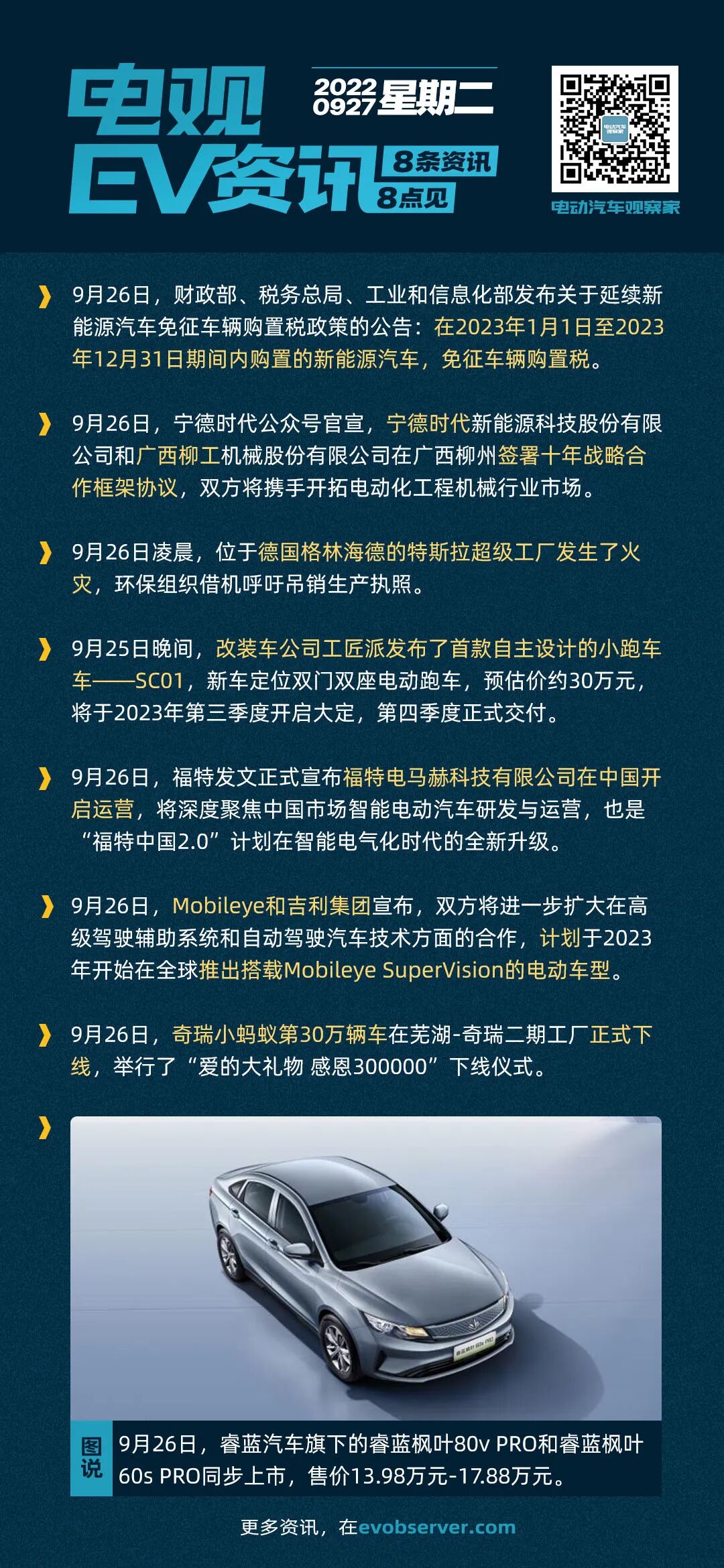 9月26日,财政部、税务总局、工业和信息化部发布关于延续新能源汽车免征车辆购置税政策的公告:在2023年1月1日至2023年12月31日期间内购置的新能源汽车,免征车辆购置税。