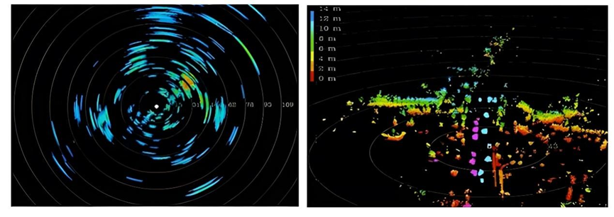 Point Cloud)点云像素复杂环境模型算法。在PP-CEM的基础上,实现了全向的多任务要求神经网络构建。这个神经网络的结果,同时配合后融合的结果,进行混合融合。实现对整个环境多种不同的天气、不同的环境工况下更精准、更精细的要素重构,(进而形成最后的行车空间)。换而言之,之前大家的全向任务处理的神经网络仍集中在机器视觉感知的领域,而飞凡的这个AI中引入了点云的参数,一同进行感知。传统毫米波雷达点云(左)和4D毫米波雷达点云(右)