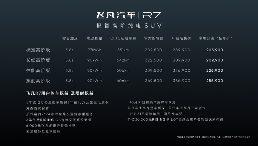 Plus、日产ARIYA、飞凡R7同时上市;后一日,零跑港交所IPO上市首日破发,收盘价下跌超30%;保时捷以84欧元的价格成为德国25年来最大规模IPO。被“野蛮人”卷了近十年之后时,传统汽车似乎在一夜之间发起了大规模的反攻。9月27日,上汽旗下第二个纯电品牌飞凡汽车,拿出了独立后的第一款产品——中大型SUV飞凡R7。4款车型补贴后售价28.99万元起,车电分离模式下则为20.59万元起,,官方零售价30.25万元起。飞凡将R7描述为“智舱界屏霸,智驾界卷王”,配置43英寸宽幅三连屏+华为AR-HUD平视系统,采用4D成像雷达为基础的“全融合智驾系统”,并全系标配换电架构以实现车电分离的商业模式。从当年的R品牌,到后来的“Fei凡”,再到如今“称王称霸”的产品定位,包括上汽在内的传统车企已告别过去谦虚谨慎的传播传统,直接拿出“野心”来昭示天下。问题是,在被特斯拉、蔚小理“教育”过的中国市场、叫个“Fei凡”就能做卷王吗?“我们系统通过匠心把数据科技做扎实。”飞凡汽车用户发展中心总经理刘晨在发布会之后的采访中表示。虽然定位为“智驾界卷王”,但飞凡R7并没有落地目前最前沿的城市领航功能,其“RISING
