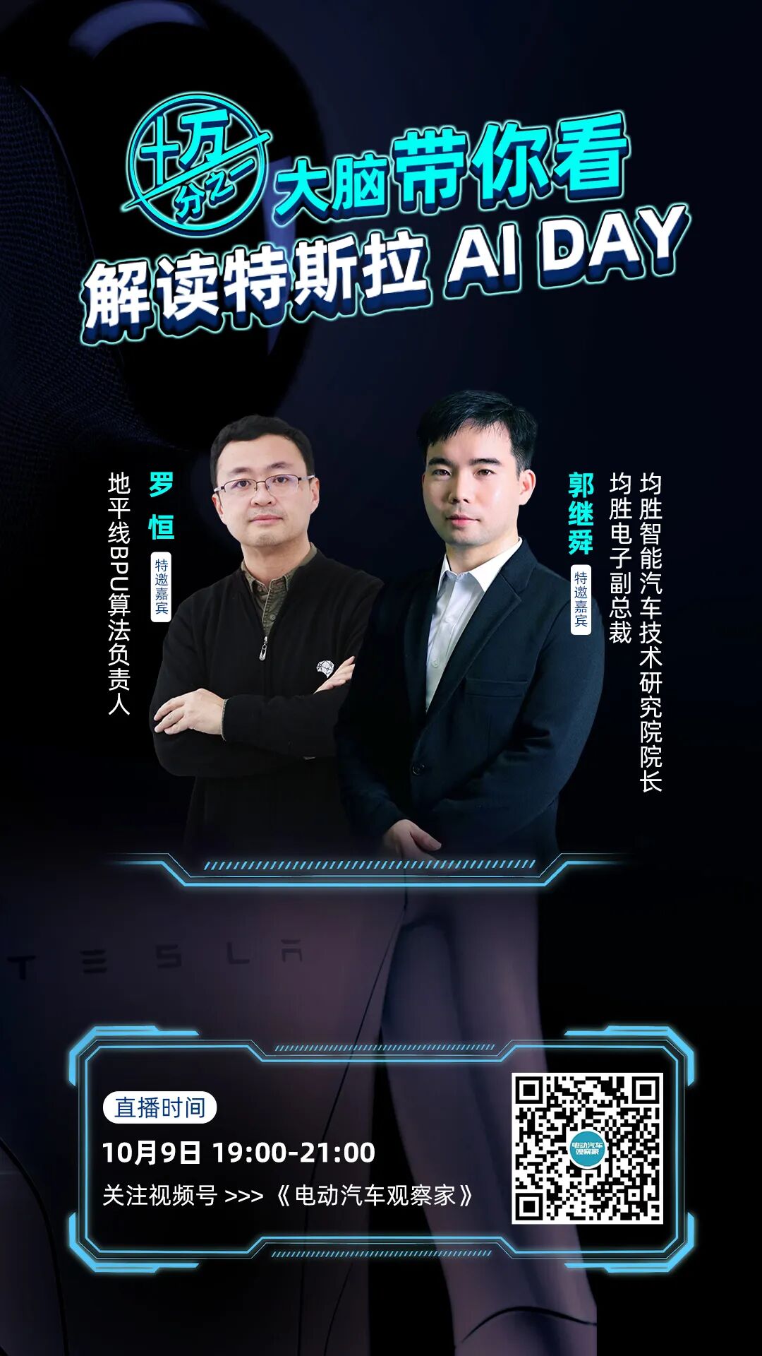 10月9日,《电动汽车观察家》特邀“十万分之一大脑”:地平线BUP算法负责人罗恒博士、均胜电子副总裁、均胜智能汽车技术研究院院长郭继舜博士,带你重看2022特斯拉AI DAY。