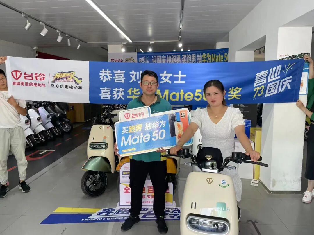 除了品牌势能及硬核产品力的助推,台铃在国庆假期期间还在全国各大终端发起在购车赢华为Mate5等活动,实力宠粉,让购车的用户直呼过瘾,加剧了终端的热销!