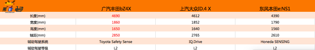 续航更安心!为进一步提升整车的动力性能以及驾驶节能性,确保尤其是冬季的实际续航里程,广汽丰田bZ4X搭载高效率三合一电机系统,配备电池温控系统,确保电池输出功率的稳定性。通过优化空气动力学设计(风阻系数0.28)、打造轻量化车身、采用能耗大幅降低的热泵空调等多项先端技术,实现在CLTC工况标准下615km的纯电续航里程*,最优电耗每百公里仅11.6度电。驾驶更安心!搭载丰田最新一代“TSS 3.0智行安全系统”,支持OTA升级,具备行业领先的辅助驾驶能力。TSS 3.0进一步扩大了毫米波雷达及单眼摄像头的检测范围,集合了PCS预碰撞安全系统(带前方行人识别)、DRCC动态雷达巡航控制系统(带全速域跟车功能)、LDA车道偏离警示系统、LTA智能车道循迹系统和AHB远光灯自动控制系统,同时还首次提出了RSA道路标识识别辅助系统、EDSS紧急驾驶停止系统、PDA预判式主动驾驶辅助系统等多项智能驾驶辅助功能。使驾驶者无论在拥堵或顺畅、白天或夜晚、上下车、以及更多无法预知的关键时刻,都能得到更及时稳固的安全守护。竞品对比:广汽丰田bZ4X VS上汽大众ID.4 X、东风本田e:NS1合资车企稳稳地凭借着自己已有的资源再进行研发,也推出了不少不错的新能源车,那么今天我们就来拿今晚上市的广汽丰田bZ4X和的大众ID.4 X、东风本田e:NS1进行简单的对比。在外观上,广汽丰田bZ4X的前脸线条十分犀利,给人一种棱角分明的感觉,前灯设计成了窄长的造型,还有全封闭式的格栅彰显新能源车身份。而大众ID.4 X的前脸也是封闭式的格栅,然后一条横镀铬连接两边的LED大灯,不过大灯的形状会稍微宽一些,再加上底部的保险杠,更加有运动风。本田e:NS1车头造型看起来比较时尚动感,看上去非常霸气。再搭配时尚简约的头灯,多了几分动感活泼。而在车身尺寸上,广汽丰田bZ4X均比其它两车型要具备明显优势。最后让我们持续关注广汽丰田bZ4X正式上市发布后的市场表现吧,欢迎大家和我在评论区交流。![]()