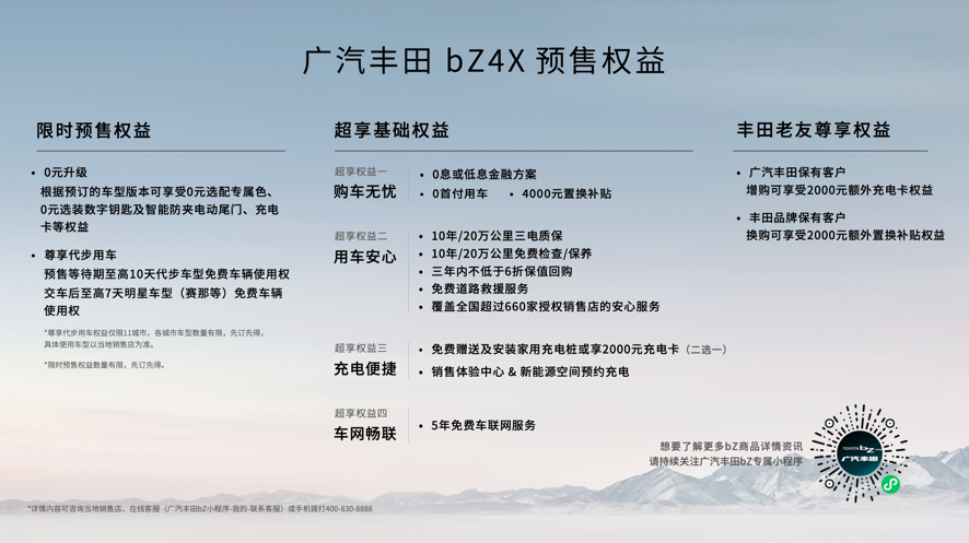 面对新时代下的电动出行需求,为给用户提供安心舒适的出行自由与享受,广汽丰田破局而来,从顾客实际需求出发,充分发挥体系能力优势,带来全维度解决方案。在为顾客提供科技智能、安心安全的产品同时,依托全新的“线下+线上”销售服务体制、完备的“销售体验中心+4S店”服务网络优势、以及升级的“直面用户”信息服务体系,围绕顾客的车生活全周期提升顾客体验,打造广汽丰田bZ4X的专属价值。与此同时,广汽丰田bZ4X还为车主提供了一系列的售后保障及丰富的购车权益,旨在为顾客提供多样化的购车选择、以及更安心的用车体验。在遍布全国的超660家广汽丰田经销店,bZ4X都可以获得10年或20万公里三电质保、10年或20万公里免费检查/保养、三年内不低于6折保值回购、免费赠送及安装家用充电桩或享2000元充电卡(二选一)、以及5年免费车联网服务等等众多超享权益。品牌信赖:25年全球2000万电动化用户的口碑之选丰田自1992年成立电动汽车研发部,历经30年电动化研发积淀,取得两万余项电动车研发专利,在三电系统(电池、电机、电控)等核心技术领域,建立了全球领先的电动化技术体系。1997年,推出世界上第一款量产HEV车型,25年间,丰田的电动化车型全球累计销量突破2000万台,并创造了电池系统0事故纪录。广汽丰田bZ4X不仅拥有丰田领先的电动化技术优势,在品质品控方面,bZ4X诞生于广汽丰田“零缺陷率”全球模范工厂,采用基于e-TNGA架构的BEV专属平台打造,秉承丰田高QDR制造标准,让每一台交付到消费者手中的广汽丰田bZ4X都具备世界一流的超高品质。作为一款面向未来出行体验的纯电车型,bZ4X将诸多最新的智能科技和安全技术融入了产品设计。新车配备了4个PVM摄像头和12个超声波雷达;搭载丰田最新一代“TSS 3.0智行安全系统”;装备了晒晒太阳就“来电”的高效太阳能充电穹顶,一天发电量可供智能手机充电约159次,一年发电量可供车辆行驶约1750km*;支持“数字钥匙”功能,通过智能手机无缝实现远程上锁、落锁、启动发动机等便捷操作;还有特别适用于新手驾驶员的“智能泊车助手”,尤其在狭窄路况下可通过手机APP将bZ4X遥控泊入车位。除此之外,还有更多令人怦然心动的前瞻理念与实用设计,让其成为与家人朋友相处的美好空间。看起来惊艳!广汽丰田bZ4X采用“Activity Hub”全新设计理念,在外观上实现了概念车100%还原,造型充满力量感和科技感。锤形鲨鱼式前脸,多眼式LED前大灯(远近光灯一体),凌厉的LED光剑式尾灯,舒展动感的车身流线,更低的引擎盖设计等等,整体高辨识度的大胆创新,无不彰显极具魅力与新潮的高级质感。坐起来惊艳!内饰设计营造“悦动港湾”家居客厅般的舒适感,安装高性能隔音玻璃,尊享极致静谧。拥有同级高水准的宽敞空间,长宽高为4690/1860/1650mm,2850mm的超长轴距,以及可媲美D级轿车的1000mm后排空间。智享座舱的数字车载生态系统,支持语音识别,支持OTA软件升级。配备远视点机舱层叠式仪表盘,融入HUD设计理念,让驾驶者几乎不需要移动目光,便可将行驶数据尽收眼底。首次采用旋钮式电子换挡,在避免误操作的同时,还使中控区域变得更加美观简洁。开起来惊艳!基于e-TNGA架构打造的广汽丰田bZ4X,地板下方的电池与车身一体化设计,框架结构采用占比高达61%的热冲压材料和高强度钢板,在提升安全性的同时还大幅降低了车身重心。驾控方面,四驱版车型搭载总输出功率为160kW的双电机,0-50km/h加速仅3.4秒,配备丰田与斯巴鲁共同开发的X-MODE四驱越野辅助模式,以及全新研发的Grip-Control智能蠕行模式,通过充分发挥电机的驱动特征,bZ4X兼顾了随心所行的公路驾控体验与涉及多种复杂路况的越野通过能力,即便遇到深雪、泥泞等极端路况都可以轻松应对,在大幅提升驾驶乐趣的同时全面扩宽了用户电动出行的生活半径。同时,面向中国市场正在积极探讨导入OMG(One Motion Grip)驾控套装,由赛手方向盘与线控转向系统组合而成,无需换手即可完成转向操作,极大减轻驾驶者的操作负担。电池更安心!基于丰田成熟的电动化技术,广汽丰田bZ4X直面消费者最关心的动力电池安全和续航顾虑,以10年后电池容量保持率90%为目标进行研发,实现全球顶级的电池耐用性。除了追求电池本身的高安全性外,车身还采用了全方位碰撞应对措施,从碰撞保护、路面冲击保护、漏液保护等多个方面确保电池包的安全。电池两侧设置宽度达230mm的碰撞缓冲结构,电池下方则安装了3.2mm铝制底罩,更好地保护电池承受来自各个方向的碰撞冲击。电池包采用“冷却回路与电池单元相隔离”的结构,并使用高阻值冷却液,防止在极端情况下冷却液泄漏而引发短路起火。