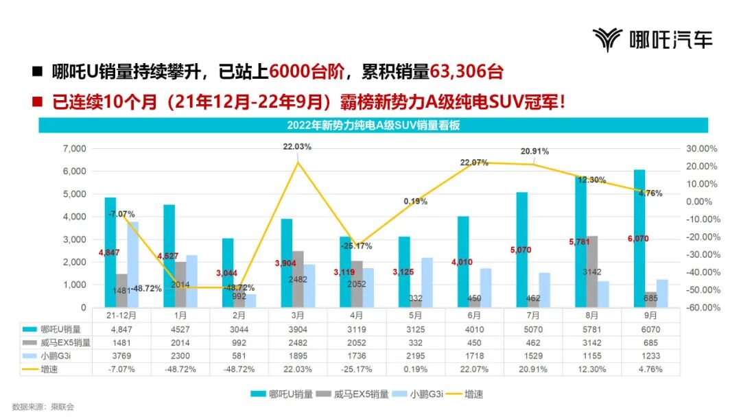 不知不觉,哪吒汽车已经连续3个月夺得新势力月销量冠军。9月,哪吒汽车交付了1.8万辆,第三次加冕新势力单月销冠。各车型中,哪吒V仍然是爆款,单月交付过万辆。A级SUV哪吒U,表现也不错,交付6070辆,占比约三分之一。已发布的新车哪吒S,还未交付。目前,新造车势力都已经走过了单款爆品时代,开始了多车型作战。哪吒汽车要保持销量排位靠前,也必须在哪吒V之外,打造出一个爆款。哪吒S要年底才交付,现在能指望的,当然是哪吒U。10月10日,哪吒汽车发布上市了哪吒U的迭代产品——哪吒U-Ⅱ。哪吒U-Ⅱ分四个细分款型,售价12.98万元-15.98万元;其中三个款型可以选装智驾包或者尊驾包,享受高级别智能驾驶辅助功能。一是除了U-Ⅱ400 Lite的三款车型,都标配8155高通智舱芯片。二是除了U-Ⅱ400 Lite的三款车型,都可以选配智驾包或者尊驾包——采用地平线征程3芯片,享受22项L2.5+级智能驾驶辅助功能。智驾包和尊驾包选装价格仅需8800元或者1.28万元。三是针对年轻用户和女性用户,特别提供了暗夜机甲黑主题和星钻魅影粉主题,而且是0元直接选。从哪吒U-Ⅱ来看,一方面哪吒仍然坚持科技平权的理念,将智能电动汽车以极高的性价比提供给消费者;另一方面,哪吒在学习对手,包括为年轻、女性用户提供专属主题,也包括提供简洁明了的车型选配等等。从这些信息来看,哪吒U-Ⅱ具备了爆款潜质。问题就在供给端能否兑现了。哪吒U是哪吒汽车推出的第二款车,于2020年3月上市,迄今总共交付量已经达到6.3万辆。“这意味着我们已经连续10个月获得了新势力A级纯电SUV的销量冠军。”哪吒汽车用户沟通部高级总监陈尹斌说。陈尹斌还以小鹏汽车同级的电动SUV G3做比:哪吒U上市以来同期的这29个月,G3总共交付量是3.36万辆。哪吒U是3的1.88倍。哪吒U的销量与其竞争力是相称的——在A级纯电SUV当中,哪吒U的性价比非常高。这款车尺寸是4549*1860*1628mm,轴距2770mm。对比其竞品,哪吒U的尺寸、价格和配置,往往都有优势。特别是,选配智能驾驶和智能座舱时,哪吒U也不会因此就加价很多。这次升级的哪吒U-Ⅱ可以说继承了智能电动性价比优势。首先,相比2021款,哪吒U-Ⅱ 400 Lite款把入门门槛还拉低了。其次,13.68万元起售的三款车型,都能享受高通8155芯片支持的智能座舱。在该芯片8 TOPS算力的支持下,哪吒U-Ⅱ的智舱采用全新科技感UI界面,支持多任务处理,有丰富的智能应用,包括高德定制化导航、腾讯视频、抖音、QQ音乐、喜马拉雅、车载K歌等。座舱还提供双12.3英寸悬浮一体式智控中央屏,全场景哪吒AI语音助手,可见即可说等等。座舱的硬件、软件在智能电动的第一梯队。为此,哪吒汽车也大胆喊出了“15万级智舱天花板”的口号。第三,400、500和610公里续航三种车型,都可以选配智驾包或者尊驾包,采用地平线征程3高性能车规级AI芯片,AI算力5 TOPS,支持L2.5+智能驾驶辅助功能,包括22项智能感知硬件,还支持FAPA全自动泊车辅助和一键式遥控泊车。这一智驾包和尊驾包只需要仅需8800元或者1.28万元,可以是市场上最经济的智驾选装包。仅仅坚持自己的优点还不够,还需要学习别人的优点,补足自己的缺点。“我们目前也存在着一些短板,比如说我们在女性的市场里面,相对比较弱势。”陈尹斌介绍,在A级纯SUV里面,30%的消费者是女性用户,而哪吒U只有16%。“我们的友商达到了20%,所以它有更大的一个市场销量。”陈尹斌说。另外,“在消费者的年龄层级上,我们也略微偏高一点点。”陈尹斌推断,“如果我们能在女性用户宣传和年轻的用户宣传里面获得增量的话,哪吒U将会取得更好的一个成功。”基于此,哪吒U-Ⅱ这次特别推出了两款全新的主题造型,来满足他们的用车需求,分别是暗夜机甲黑和星钻魅影粉,而且都是0元选配。暗夜机甲黑外观