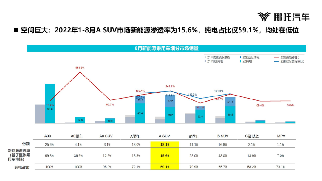 哪吒U-Ⅱ还为女性设计了一些专属场景需要的配件。比如,手扶箱里面会有专门的化妆品储物格,主驾和副驾都配备了超大的美妆镜,还带有环绕的LED补光灯。除了学习对手,迎合年轻人和女性用户,哪吒也参照了同行在车型SKU(最小存货单位)设计方面的经验教训,在哪吒U-Ⅱ上,尽量做到简洁明了,而且选配价格不高、非常实惠。细分款型上,哪吒U-Ⅱ按续航分成三个航,用户很容易对号入座。入门版Lite追求经济实惠,智舱、智驾都可以不选。而其他三个车款,智舱都是标配,用户可以自选是否需要智驾功能。如果需要,也只要花费1万元左右,就能直接满配,不用再选。对于豪华、智能配置有更高需求的用户,直接选到最长续航+尊驾包,所有配置直接拉满,无需再精打细算。如果只选续航和智能化,哪吒U-Ⅱ就是3个续航*2种智驾选择+1个续航*0智能=7个选择。在续航、智能配置之外,用户还可以选择6种外观颜色或主题,到此为止,总共就是7*6=42个选择。这响应了消费者购车习惯的变化。受手机等智能设备影响,消费者越来越倾向于简单的购置选项,而对复杂款型产生排斥心理。如今,电动化走向深入,新能源渗透率在各个细分市场都在不断提高。与此对应的是,新造车势力企业,也需要多管齐下,用多个车型满足不同市场需求。对于哪吒汽车而言,目前对哪吒V的依赖比较高,但是哪吒U所在的A级SUV市场有很大空间。首先,A级SUV在整体乘用车市场就是很重要的一块——市场份额约为四分之一,中国一年能卖约600万辆左右。其次,A级SUV的新能源渗透率只有15.6%,而且,新能源A级SUV中,纯电比例也只有6成左右——就是有很多的插混A级SUV,比如比亚迪宋Plus。因此,可以说哪吒U处在一个空间巨大的细分市场里面。不过,也可以说,A级车既不像高端车那样,用户购买力强,又不像A00级、A0级那样对空间、性能无欲无求。A级车用户最大,但是最挑剔。哪吒U-Ⅱ这种实诚的风格,极高的性价比配置,适合A级车用户。甚至,这种价格,不由让很多人怀疑它亏本卖车。不过,研发、工厂等投资已经在那里了,哪吒降本的措施只能是实现更大规模的产销,来摊薄成本。于今日的哪吒U-Ⅱ乃至哪吒汽车而言,最大的挑战还是先求规模,再求利润。哪吒U-Ⅱ如果能够成为继哪吒V之后的一个新爆款,无疑将为哪吒汽车在销量、融资都打入强心针,实现一次决定性的跃升。