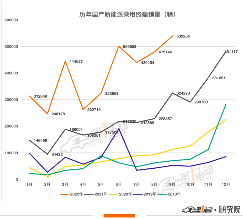 根据公安部交强险数据,2022年9月新能源乘用车终端销量(上险量)达539,254辆,同比增长66.3%,环比上涨12.5%,创历史新高。其中纯电动车终端销量406,898辆,环比上涨10.4%,插电式混合动力车终端销量132,352辆,环比上涨19.9%。私人市场终端销量419,246辆,占比上涨0.6个百分点至77.7%;单位市场终端销量56,460辆,占比上涨1.1个百分点至10.5%;出租租赁市场终端销量63,366辆,占比下降1.7个百分点至11.8%。