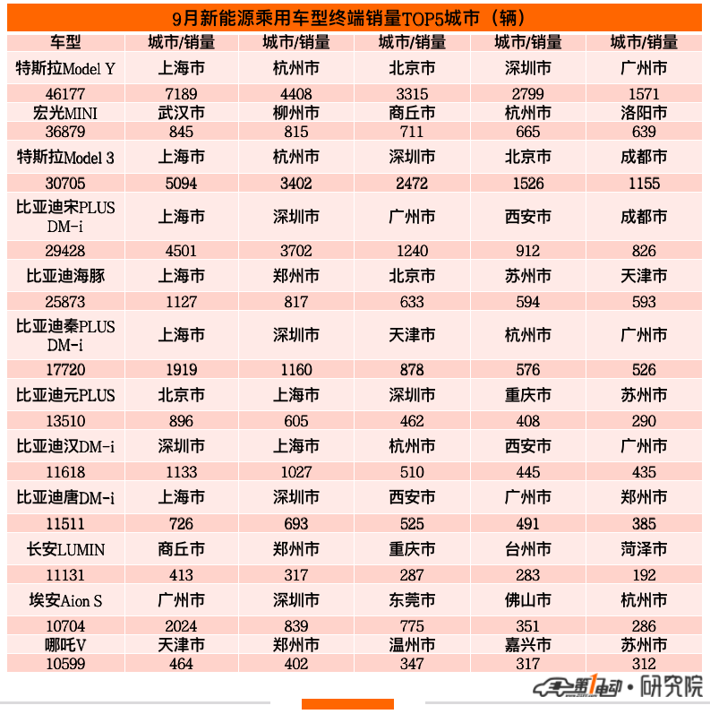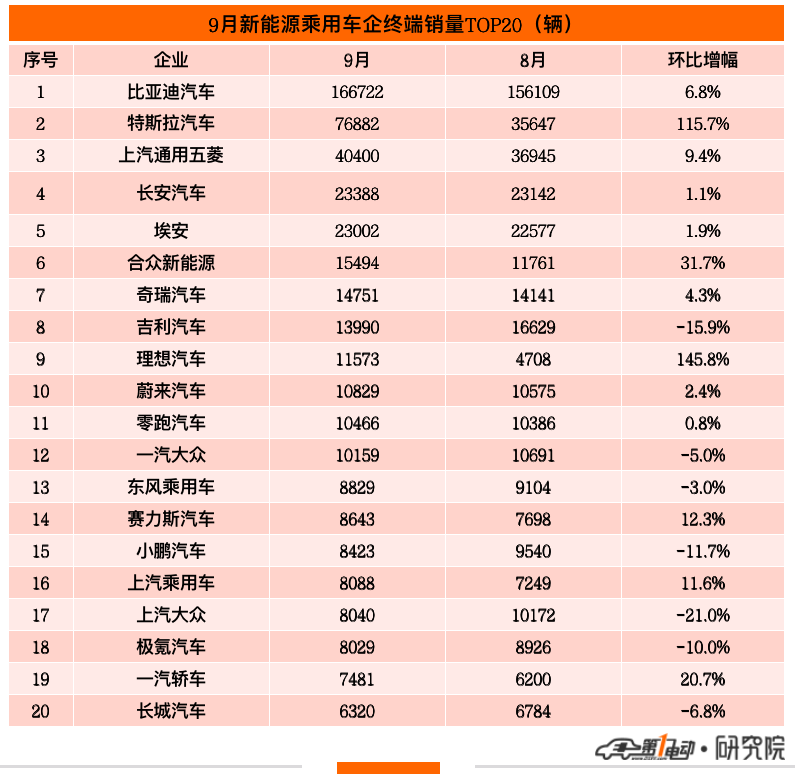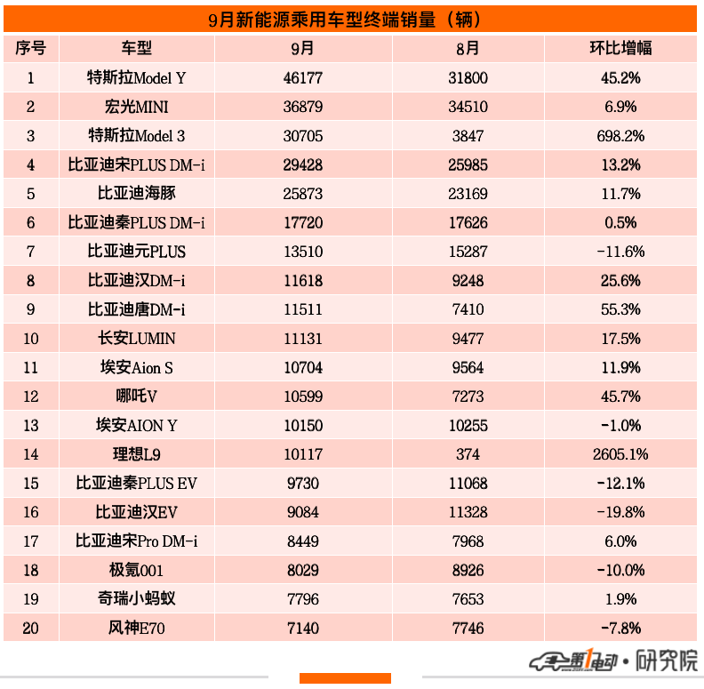 值得注意的是,长安LUMIN终端销量突破万辆,环比上涨17.5%,超越埃安Aion S跻身榜单第10。理想L9终端销量突破万辆,首次上榜跻身第14,预计10月有望跻身前十。哪吒V终端消息首次突破万辆,环比上涨超40%,排名上升八位至第12。