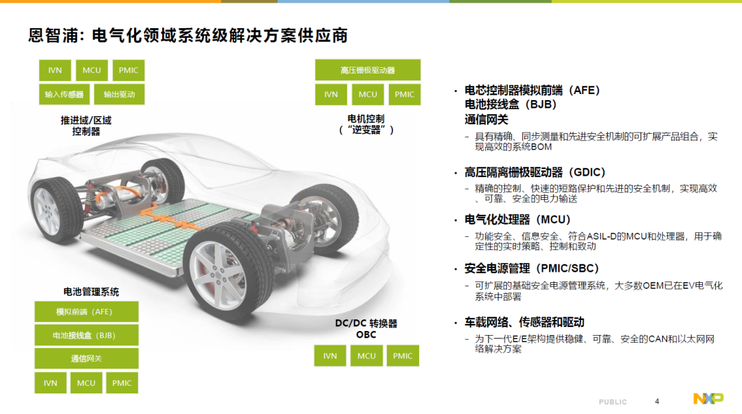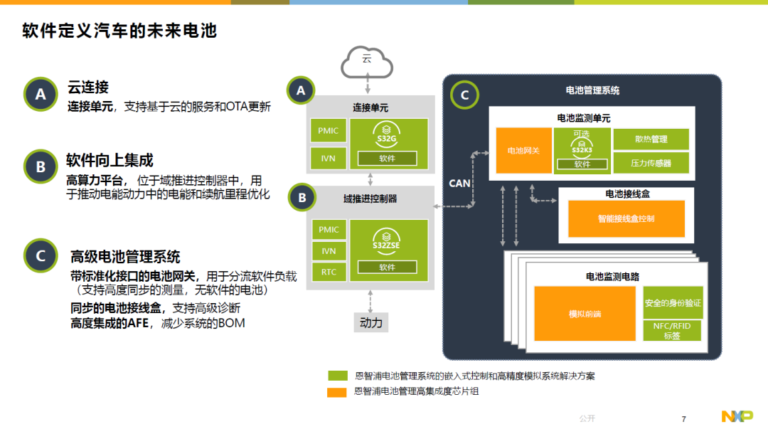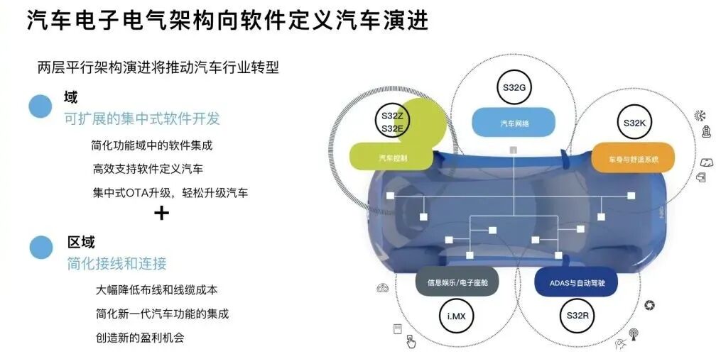 /section>“所以最重要的是增强和最终客户(车企、电池厂)的互动,明白客户的电子电气需求,最终要解决什么问题;第二是要有长期的系统级的创新规划,形成从系统创新到产品创新再到IP创新的链条。”“这样不等客户提要求,就基本可以预测客户在几年后的需求,才可能以半导体研发的周期去适应现在的市场变化速度。” 李晓鹤表示。但车企的需求并不一致。芯片是一个开发成本动辄数十乃至上百亿美元的资金密集型产业,百万片的盈亏平衡线绝非一两家车企的体量能够支持。如何在芯片产品通用化特性,与车企对自身产品区别化追求之间,实现平衡?在目前产品当中,恩智浦打造具备高复用性的基础内核,一方面能够加快产品迭代速度,另一方面也可在此通用性的内核之上为车企提供一些定制化的产品。但李晓鹤也表示,未来不排除将提供一些定制化的芯片。但将基于三个前提:在技术上具备通用性;在商业上有具备共同的基础;基于高通用性的IP打造。主机厂与芯片供应商的合作早已不拘泥在一个产品之上,而是在更大的整车系统级层面展开。“其实我们和长城中午也在聊,电子电气架构(以下简称EEA)是不是应该节点越少越好,现在来看也要打一个问号。”恩智浦大中华区汽车电子市场总监周翔谈到,“EEA架构最大的变化就是一直在变动,大家的路线各有不同,是一个百花齐放的状态。”在燃油车时代,EEA架构的技术路线基本定型。T1根据车企的整车设计需求给出具体的EEA设计,并整合相应的控制、网关和线束布局。但进入电动智能化时代后,EEA从普通的底层通路上升成为了汽车的硬件神经网络。虽然仍是博世率先明确了从分布式向集中式,最终向中央计算平台演进的技术路线,但目前尚未有一家T1能够提供一款具有普适性的电动智能化汽车的EEA架构设计。各家车企根据自身产品功能定位和技术能力,EEA架构的域控制的排布方式,域融合的选择类型,通讯网络类型都大有不同。于是与底层核心零部件——芯片厂商合作就成了主机厂求快求新的必然选择。此前,长城与恩智浦在ADAS、电气化、车载网络等方面已有长期合作。而这一次,双方成立联合创新实验室,聚焦新一代电子电气架构的共同研发和定义。恩智浦认为未来电子电气架构将由两层平行架构构成。支撑可扩展的集中式软件开发的上层域控/计算平台;大幅简化了接线和连接的下层区域则可降低成本,创造新的盈利机会。在此推演之上,恩智浦推出了S32系列产品,涵盖车控、车身、网关、新能源、智舱、智驾各部分MCU/MPU的需求。此外,恩智浦正在全力研发一款支队高阶智能驾驶网联汽车的5nm制程的产品。“恩智浦很高兴与长城汽车加深合作,以S32汽车处理器平台强大的产品力为基石,共同释放下一代电子电气架构的创新潜能。”恩智浦资深副总裁兼大中华区主席李廷伟表示。主机厂与T2芯片商再进一步的合作不仅限于仍在变动中的智能化领域,在已较为成熟的电动化产业中仍有潜力可进一步挖掘。此次恩智浦分别与蔚来和小鹏在BMS AFE(电池管理系统模拟前端芯片)和高级高压隔离栅极驱动芯片领域进行合作。其中,恩智浦最新一代高精度18串ASIL-D电池管理模拟前端IC解决方案将在小鹏汽车实现全球首发,并计划在2023年实现量产。BMS AFE通常应用于电动汽车、高压移动设备、备用电池系统和高压数据采集系统上。![]()