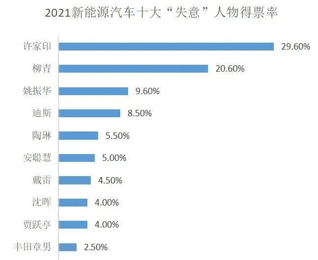 2021年,是全球新能源汽车市场的爆发之年,但是,并不是所有人都很开心。全球新能源汽车行业的一桩桩大事令人难忘,这些事件的主人公也让人印象深刻。他们或意气风发,在智能电动化的浪潮中,成为资本界追捧的明星;或人气爆棚,以差异化的产品,被用户夸赞;也有人创业失败,无法挽回企业下坡的困局,被多方怒怼,甚至被迫离开创始企业。对于这些全球新能源汽车行业的风云人物,《电动汽车观察家》向读者发起投票,选出2021年度十大“得意”人物和十大“失意”人物,和大家回顾过去一年,新能源汽车行业发生的大事和背后的人物故事。本期我们来盘点十大“失意”人物,人物出场顺序按得票数从高到低排列,如下图。![]()