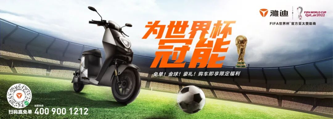 据了解,2006年后,FIFA世界杯赞助方案进行了一系列调整,其中有两条原则:必须是各领域的最佳品牌,且理念要与国际足联精神契合。这就不难理解,在全球电动两轮品类中,为何唯有雅迪能够牵手世界杯,甚至“梅开二度”。1、大国品牌实力雅迪是行业首家上市企业,全球7大生产基地,连续5年销量全球第一,2021年销1386万台,市占率绝对领先,并被央视认定为行业领航者和科技生活引领品牌。2、中国智造代表雅迪以首创的TTFAR石墨烯电池等领先出行科技横扫全球市场,并推出了行业唯一单系列销量破1000万台的雅迪冠能系列。而雅迪所领航的低碳出行领域,也与本次世界杯提出的创新、可持续、低碳理念高度契合。3、全球化成果雅迪出口100个国家和地区,全球用户超6000万,行业唯一在海外建立生产基地,品牌享誉欧洲、美洲等全球市场,为行业出海打造成功范本。4、体育营销标杆雅迪深耕体育营销多年,除了赞助2018年世界杯,还是中国女排官方赞助商,拥有成熟的体育营销经验和成功案例。本届世界杯通过“雅迪星球”小程序、微博等社交媒体,与全球用户一起“为世界杯冠能”,并举行“购车抽金球赢免单”等活动助推销售,实现营销闭环。5、资源整合能力就世界杯资源,除了携手FIFA,雅迪与央视也达成了战略合作,强势登陆CCTV全平台,拉满高空势能;在线下社区、核心商圈、终端门店实现精准投放和强力曝光。全面覆盖“海陆空”,资源运用炉火纯青。综上所述,雅迪代表中国品牌“驶入”世界杯赛场的背后,有着强大的“冠军底气”。所以,如果不是雅迪,还能是谁?投稿邮箱:439014078@qq.com