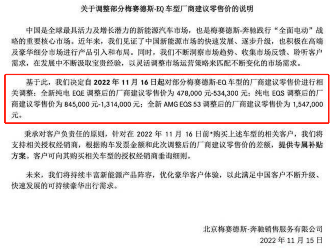最离谱的恐怕就是“不坑穷人”奔驰了,其旗舰电动车型EQS官方降幅高达23万元之多;除此之外,“小一号”的EQE也降了5万元。