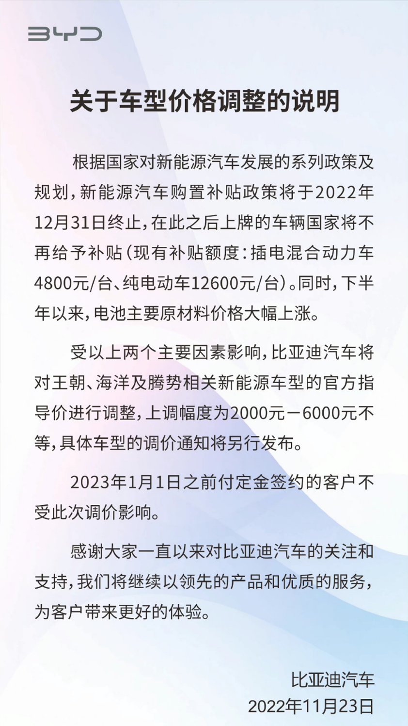 11月23号上午,比亚迪突然发布了一则《关于车型价格调整的说明》。