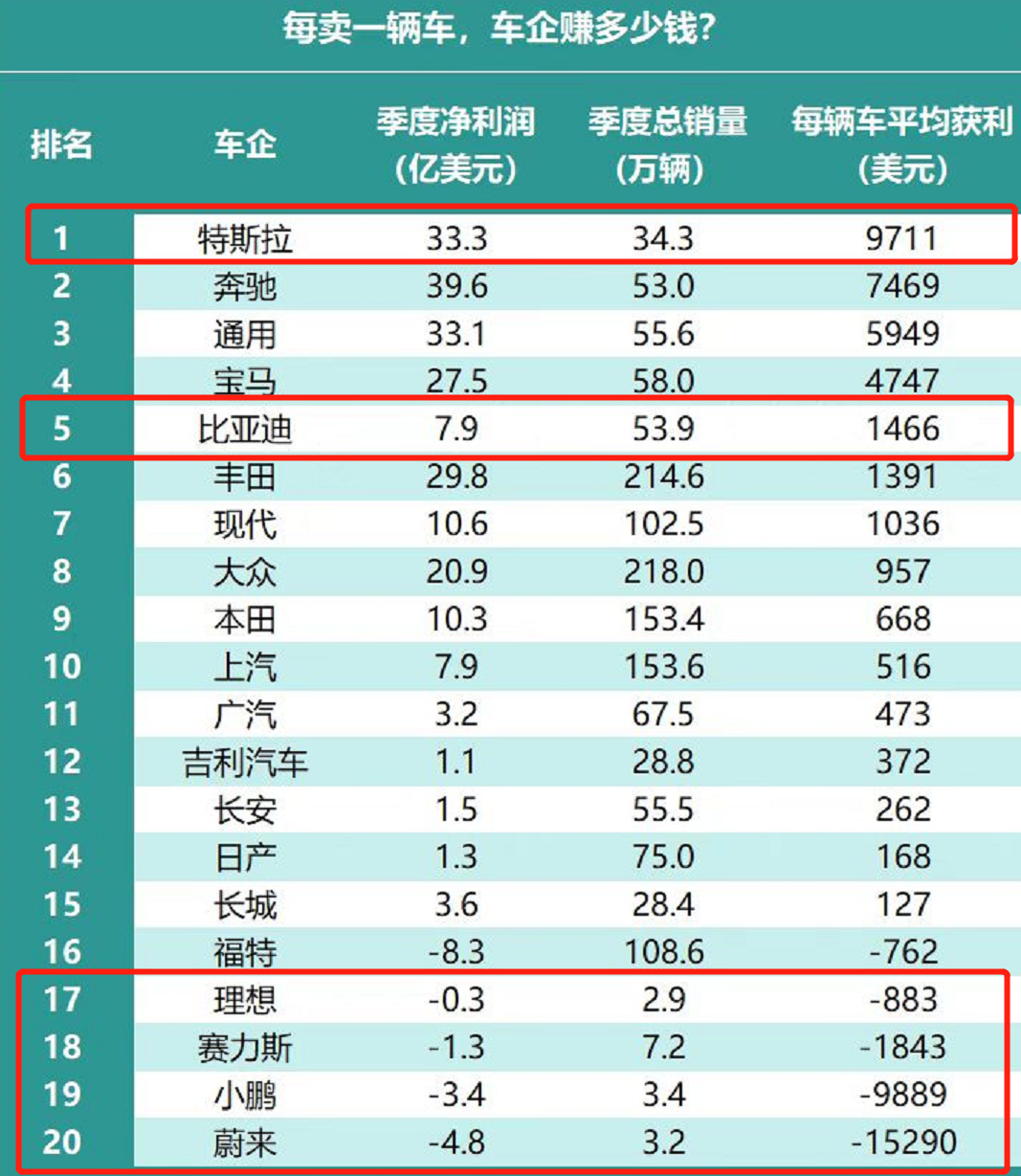 前段时间,我在网上刷到了一张有意思的图表,内容是“车企卖一辆车能赚多少钱”。