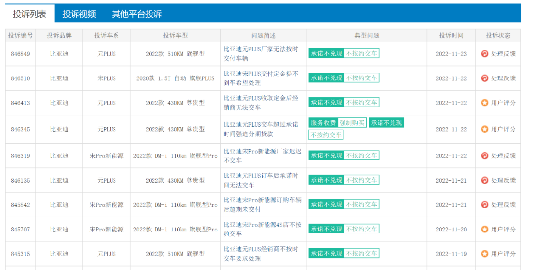 比亚迪在车质网上的投诉量是比较大的,可再看看投诉原因,大多都是挂着“承诺不兑现,不按约交车”的标签。