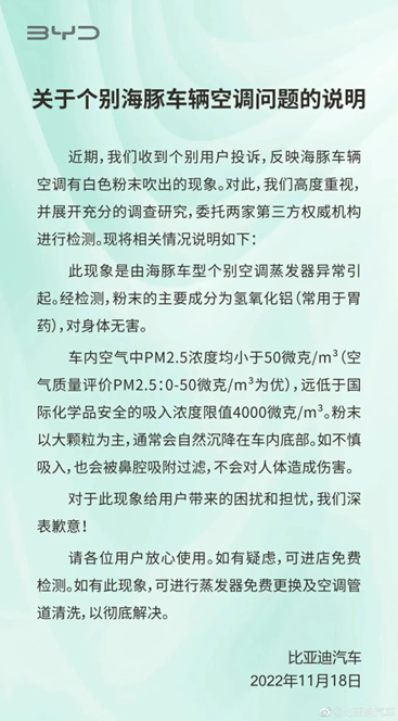 比亚迪的调查还算反应及时,后续发布了《关于个别海豚车辆空调问题的说明》,并公开致歉。