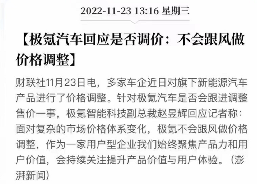 比亚迪调价之后,极氪第一时间做出了回应,称 “不会跟风做价格调整”。