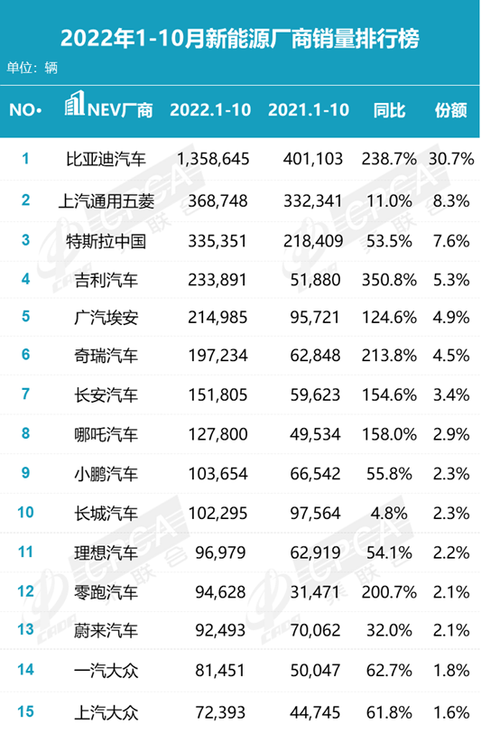 就拿今年1-10月份的数据来说,比亚迪一共卖了136万辆,市场份额超过30%,与第二名五菱和第三名特斯拉拉开了不小的差距。
