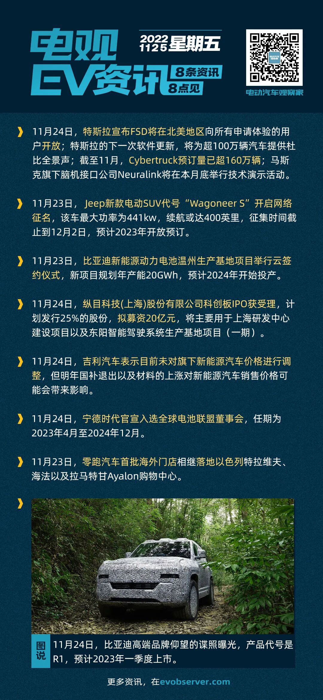 11月24日,特斯拉宣布FSD将在北美地区向所有申请体验的用户开放;特斯拉的下一次软件更新,将为超100万辆汽车提供杜比全景声;截至11月,Cybertruck预订量已超160万辆;马斯克旗下脑机接口公司Neuralink将在本月底举行技术演示活动。