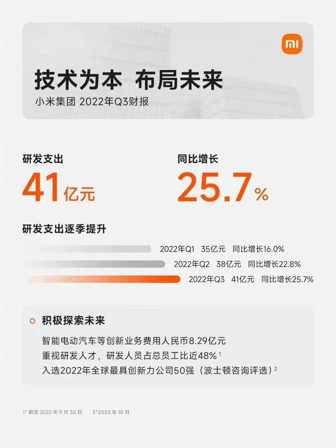 会议透露信息包括:小米第三季度对包括汽车在内的创新业务投入费用高达8.29亿元,占总研发支出的20%;今年前三个季度小米在造车业务上的总投入为18.6亿元;目前小米造车团队规模已达1800人。