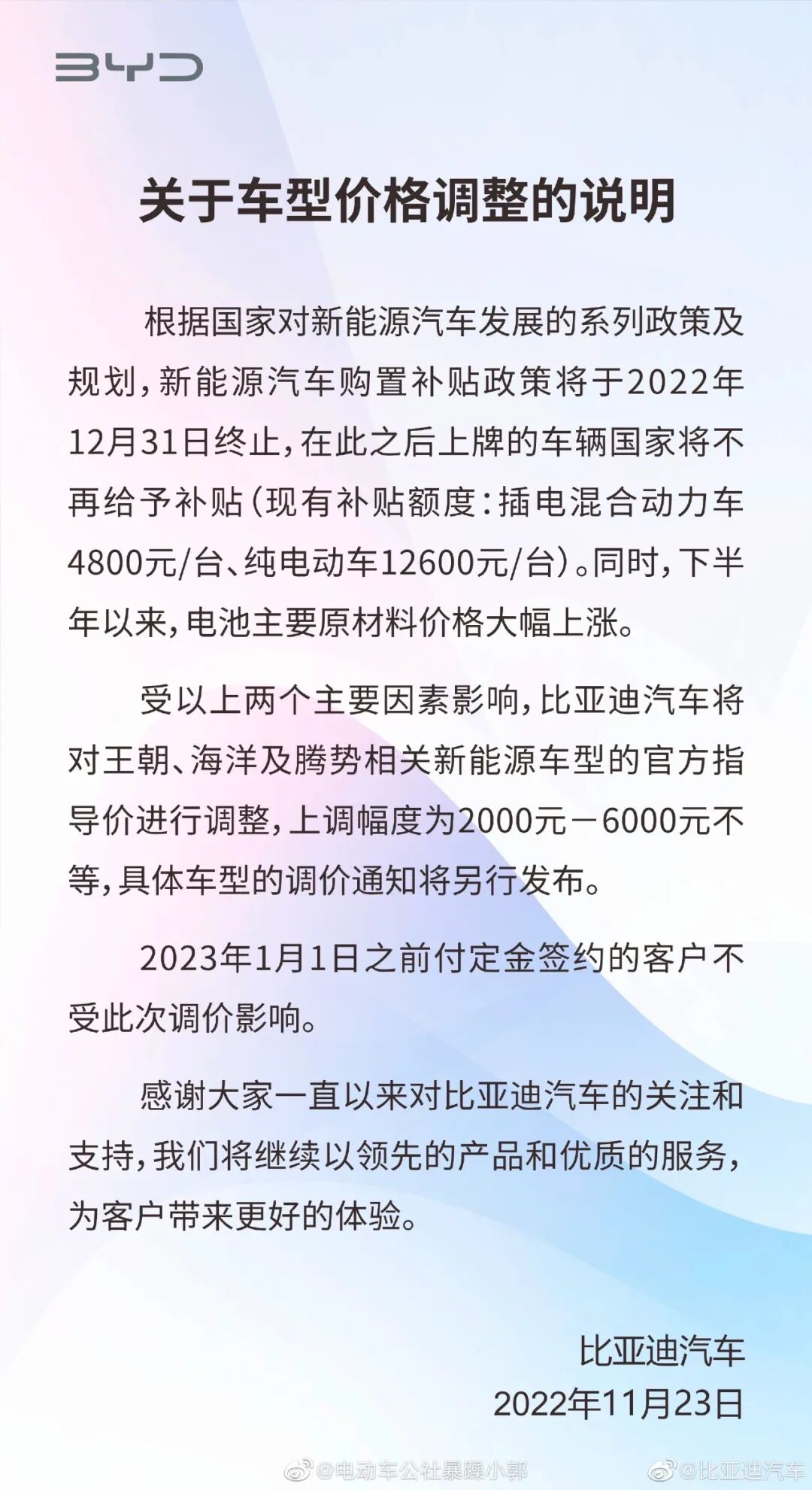 11月23日,比亚迪官博发布消息,比亚迪汽车将对王朝、海洋及腾势相关新能源车型的官方指导价进行调整,上调幅度为2000元至6000元不等。具体车型的调价情况尚未公布。此外,2023年1月1日之前付定金签约的客户不受此次调价影响。